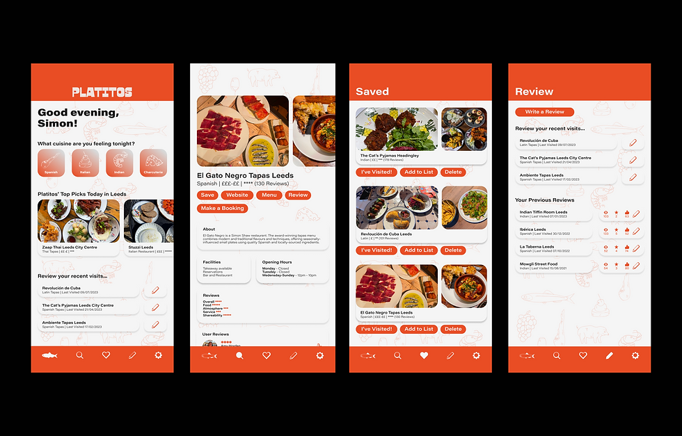 "Platitos" is an App concept created using Figma, tailored to those including students and adults (age 18-35) in which it will allow users to navigate Leeds’ finest restaurants that involve a ‘tapas’ style of eating. Whether that be traditional Spanish Tapas, small Indian Street Food plates, Italian sharing appertisers and more. It will be an interface where users can contribute with reviews on the atmosphere, food, service etc. The audience that will be attracted will be primarily couples and groups of friends that love to share all their favourite delicious dishes with each other.